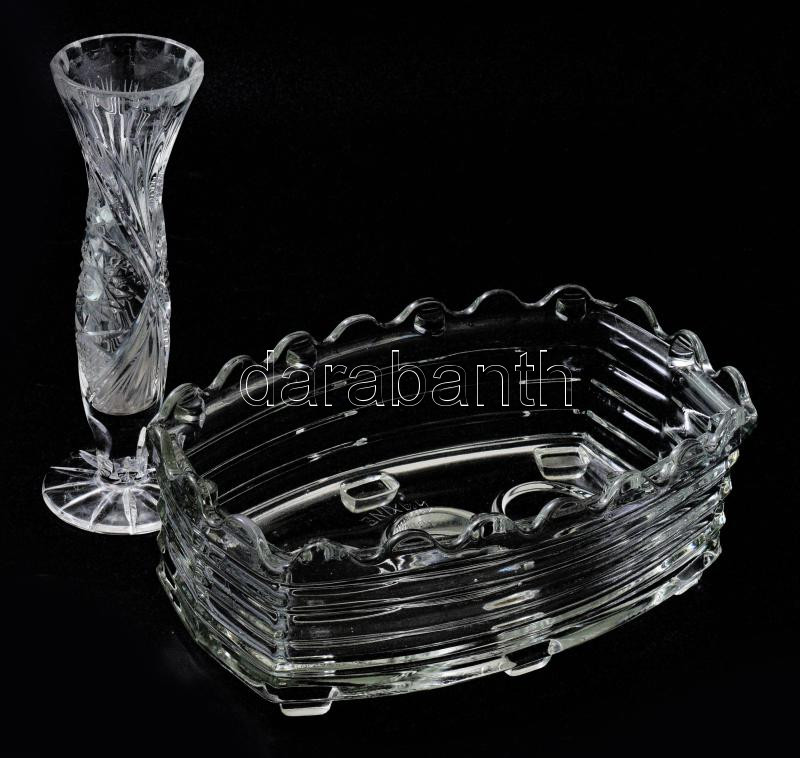 Leírás: Üveg kínáló tál, közepén lyukkal, 24x16 cm + kristály váza 21 cm