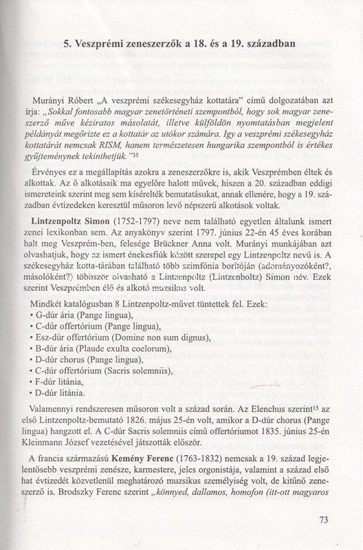 M. Tóth Antal (sz. 1940) veszprémi orvos, zenész zenetörténeti áttekintésében a püspökség jelenlétének és az iskolavárosi létnek köszönhetően művelt, polgári városnak számító Veszprém XVIII-XIX. századi zenetörténetét dolgozza fel. Művéhez jelentős segítséget nyújtott az 1825-től vezetett veszprémi zenei lajstrom, az úgynevezett Elenchus, melynek köteteiben a katolikus klérus tagjai lejegyezték és katalogizálták a város egyházzenei és világi zenei bemutatóit. Az oldalszámozáson belül gazdag szövegközti képanyaggal kísért zenetörténeti mű bő társadalmi keretben mutatja be a város történetének komolyzenei összevetőjét.