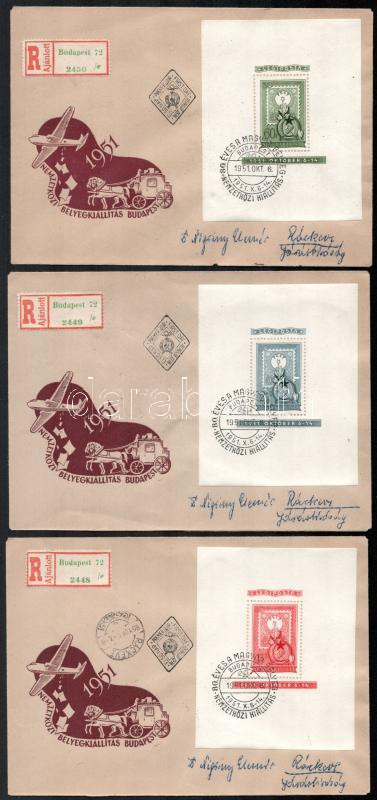 Leírás: 1951 80 éves a magyar bélyeg blokksor 3 db futott ajánlott FDC-n Budapestről Ráckevére, ritka