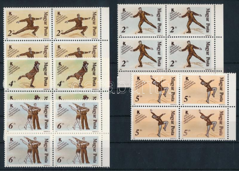 Leírás: 1988 Műkorcsolyázó VB 4 db sor négyestömbökben, az egyik 5Ft bélyeg festékelkenődéssel
