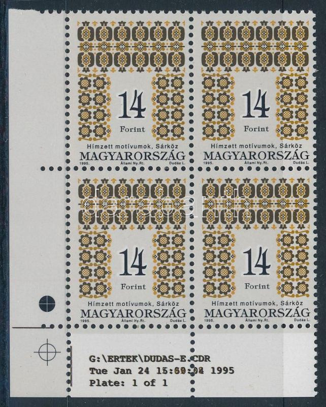 Leírás: 1995 Magyar népművészet 14Ft ívsarki négyestömb ívszéli feliratokkal