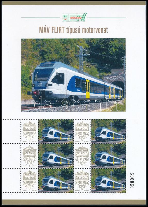 Leírás: 2025 MÁV FLIRT típusú motorvonat 6 bélyeges megszemélyesített kisív dísztokban