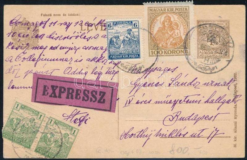 1922 Expressz díjjegyes levelezőlap Koronás Madonna 100K és 3 db Arató... https://www.darabanth.com/hu/498-Gyorsarveres/498.0/Magyar-filatelia-es-postatortenet/A-Korona-inflacio-idoszaka~2500023/1922-Expressz-dijjegyes-levelezolap-Koronas-Madonna-100K-es-3-db-Arato-belyeggel-kiegeszitve~II3289117