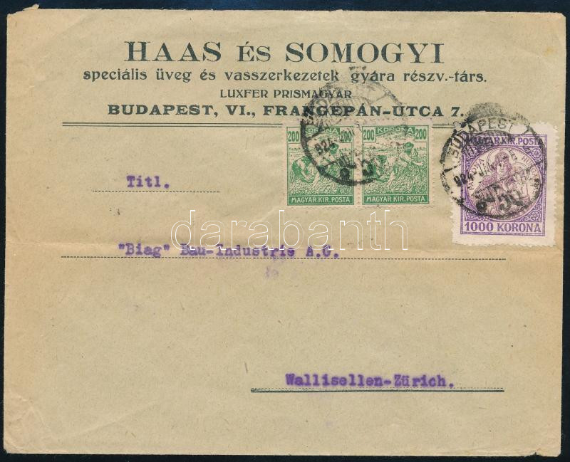 Leírás: 1924 Levél 1400K bérmentesítéssel Budapestről Zürichbe