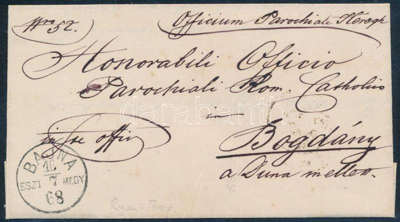 1868 Hivatalos levél "BAJNA / ESZT. MEGY." - Bogdány https://www.darabanth.com/hu/498-Gyorsarveres/498.0/Magyar-filatelia-es-postatortenet/Az-1867-es-kiadas~2500028/1868-Hivatalos-level-BAJNA-ESZT-MEGY-Bogdany~II3256015