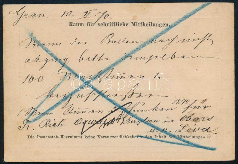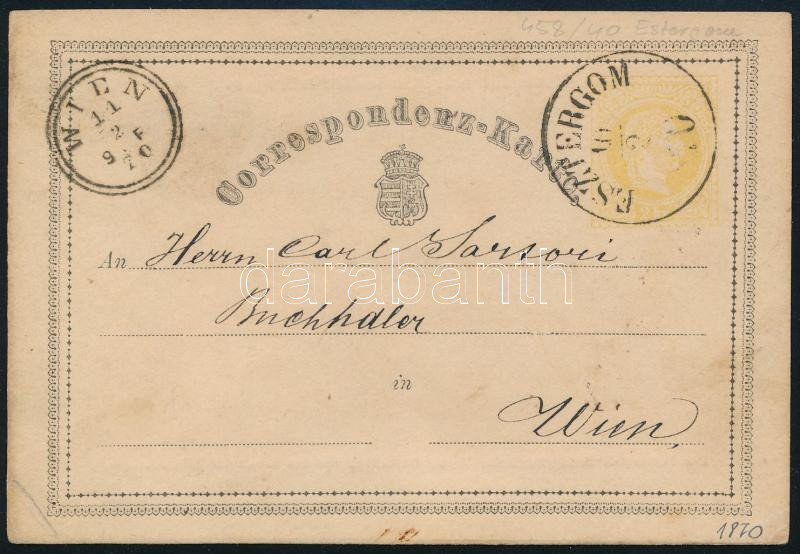 Leírás: 1870 2kr díjjegyes levelezőlap "ESZTERGOM" - "WIEN"