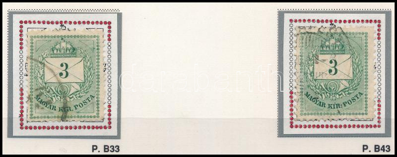Leírás: 1874 2 db Színesszámú 3kr durva gyöngyjavítással (ex Orbán, Sebestyén aranyérmes kiállítási anyagból)