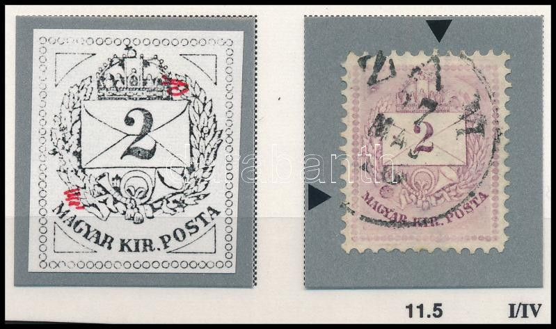 Leírás: 1881 Színesszámú 2kr korona és kürt mellett vésetjavítás, nagyon ritka (ex Orbán, Sebestyén aranyérmes kiállítási anyagból)