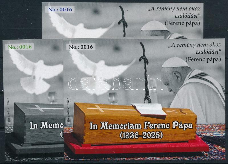 2025 In Memoriam Ferenc pápa garnitúra (3 db) 0016 sorszámmal https://www.darabanth.com/hu/498-Gyorsarveres/498.0/Magyar-filatelia-es-postatortenet/Emlekivek~2500060/2025-In-Memoriam-Ferenc-papa-garnitura-3-db-0016-sorszammal~II3400237