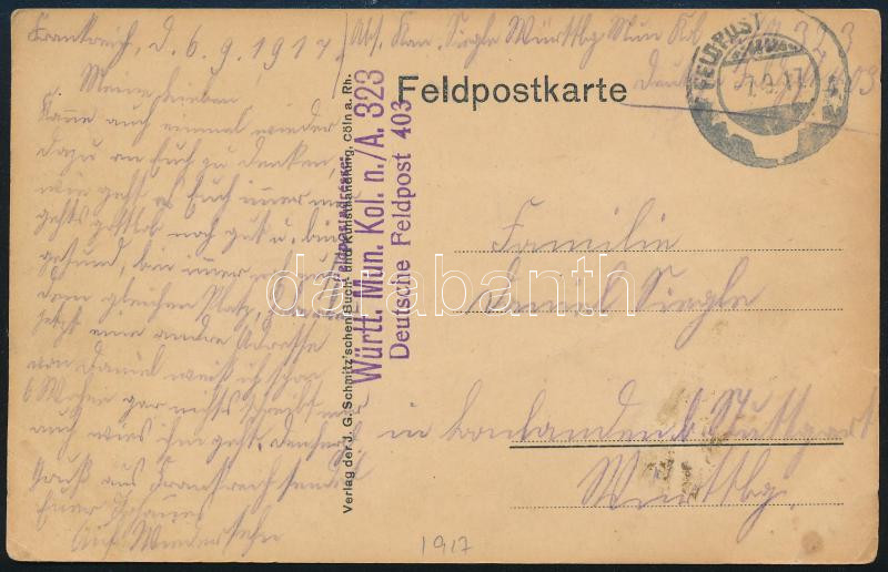 Leírás: 1917 Képeslap (Köln) "Württ.Mun.Kol.n./A. 323 Deutsche Feldpost 403"