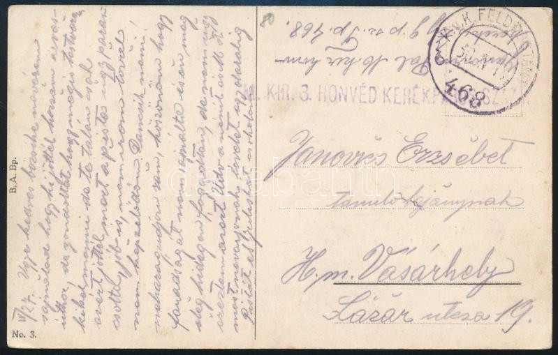 Leírás: 1918 Tábori posta képeslap "M. KIR. 3. HONVÉD KERÉKPÁROS SZAKASZ" + "FP 468"