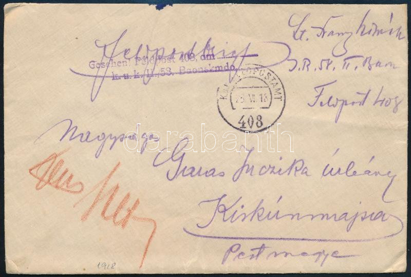 1918 Tábori posta levél Kiskunmajsára, "FP / 408" https://www.darabanth.com/hu/498-Gyorsarveres/498.0/Magyar-filatelia-es-postatortenet/I-Vilaghaborus-osztrak-magyar-tabori-posta~2500041/1918-Tabori-posta-level-Kiskunmajsara-FP-408~II3248299