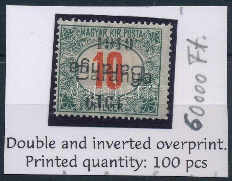 Leírás: Baranya I. 1919 Portó 10f kettős felülnyomással, az egyik fordított, Bodor vizsgálójellel