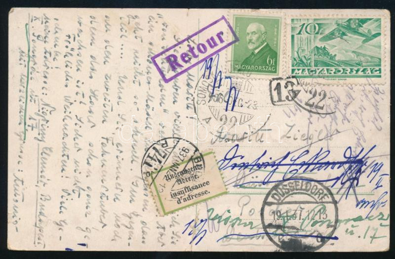 1937 Képeslap Düsseldorfba, visszaküldve https://www.darabanth.com/hu/498-Gyorsarveres/498.0/Magyar-filatelia-es-postatortenet/Pengo-idoszak-1926-1944~2500024/1937-Kepeslap-Dusseldorfba-visszakuldve~II3290958