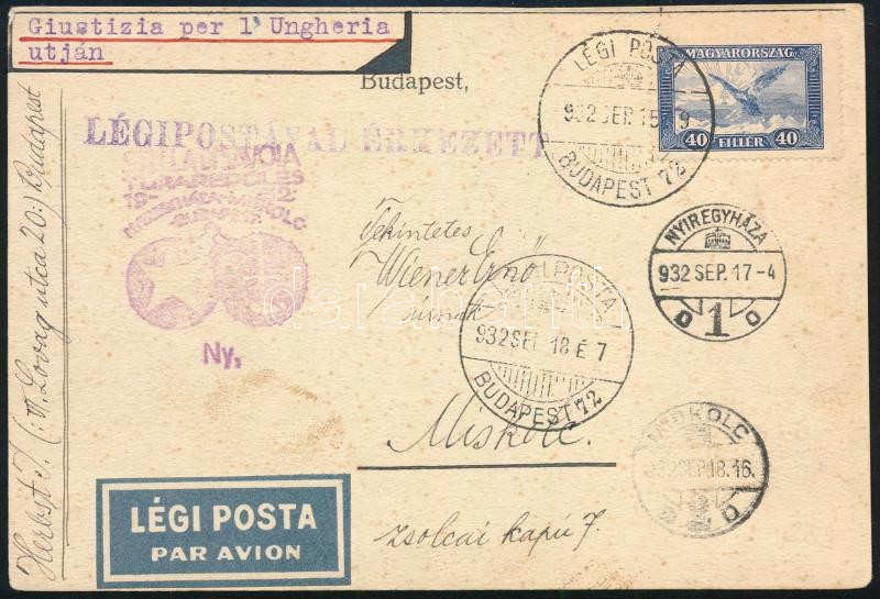 1932 Légi levelezőlap 40f bérmentesítéssel "STELLA DI SAVOIA TURAREPÜLÉS" bélyegzéssel, Giustizia per l'Ungheria útján