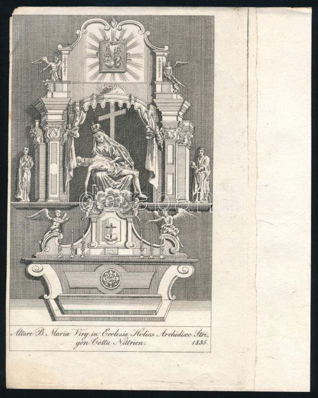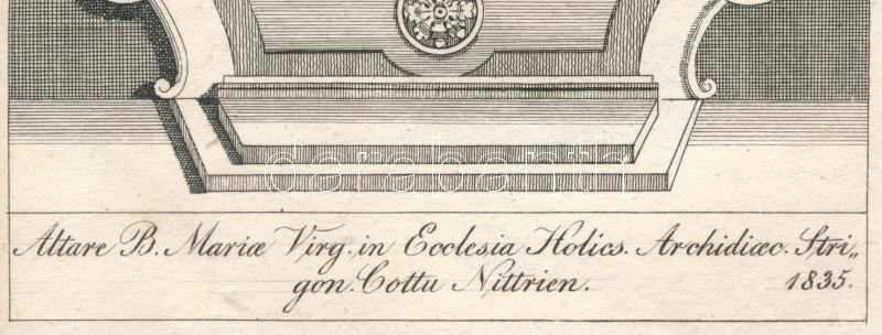 1836 A holicsi Fájdalmas Anya búcsújáró helyének oltára (Altare B. Mariae Virg. in Ecclesia Holics. Archidioec. Strigon. Cottu Nitrien). Rézmetszet, papír, 18,5x11 cm. [In: Jordánszky Elek: Magyar országban 's az ahoz tartozó részekben lévő Bóldogságos Szűz Mária kegyelem' képeinek rövid leírása. Pozsony, 1836.]