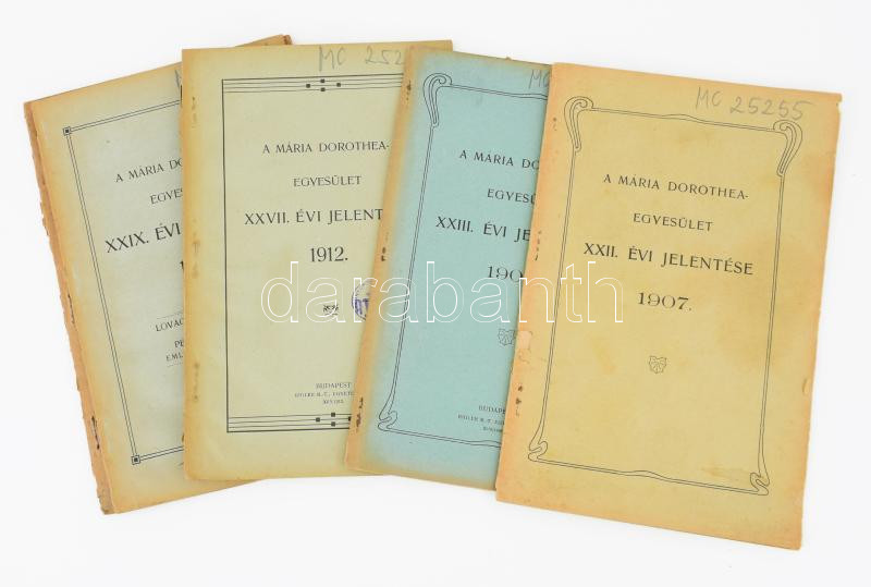 Leírás: 1907-1917 A Mária Dorothea-Egyesület jelentései, 5 db. Bp., Rigler R.T.-ny. Kiadói tűzött papírkötés, változó állapotban, sérülésekkel, intézményi bélyegzőkkel.