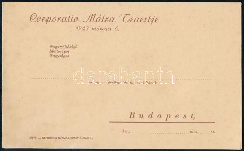 Leírás: 1941 A Corportaio Mátra teaestjére szóló meghívó levelezőlap