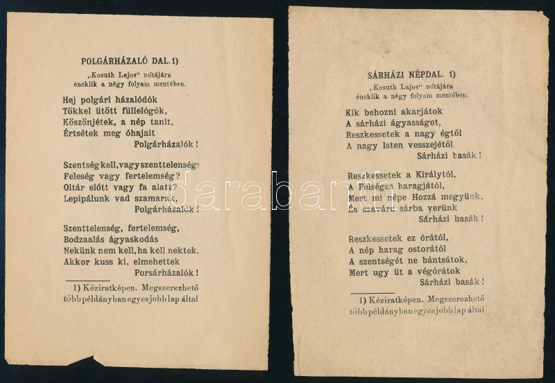 Leírás: cca 1900 2 db politikai propaganda röplap: Polgárházaló dal, Sárházi népdal címekkel.