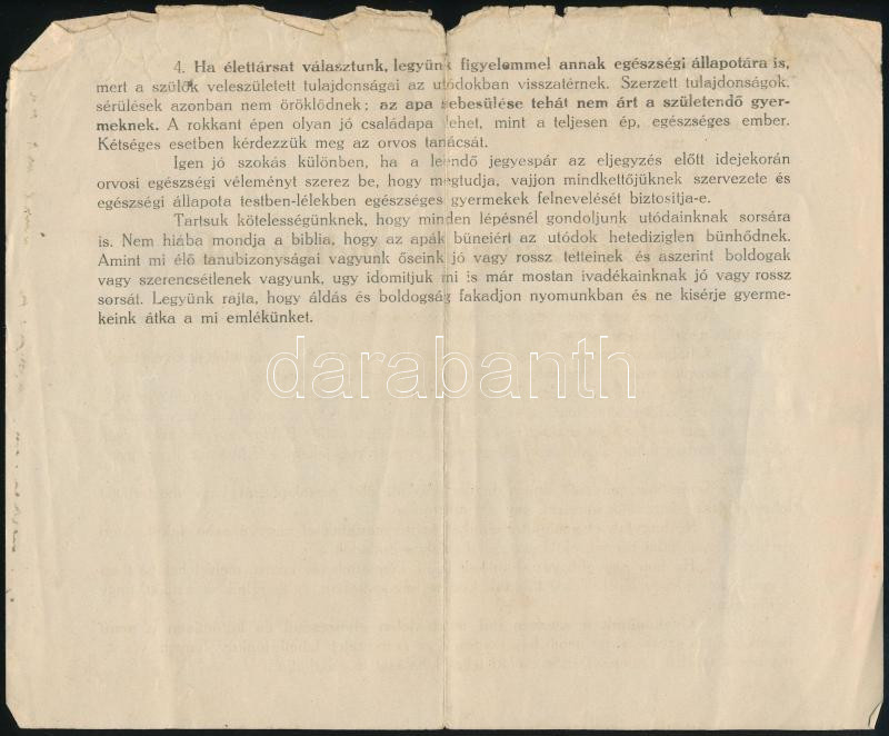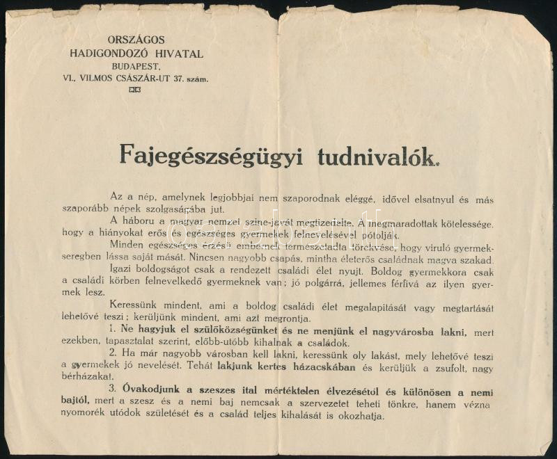 Leírás: cca 1910-1920 Fajegészségügyi tudnivalók, a budapesti Országos Hadigondozó Hivatal tájékoztatása, a lap széle kissé sérült, 17x20,5 cm