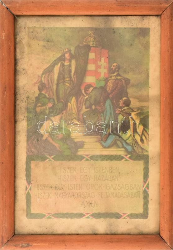 cca 1927 Magyar Hiszekegy Terjesztő bizottság és Budapesti városháza által lepecsételt, hivatalos Hiszekegy plakát. 25x35 cm Üvegezett keretben, Foltos