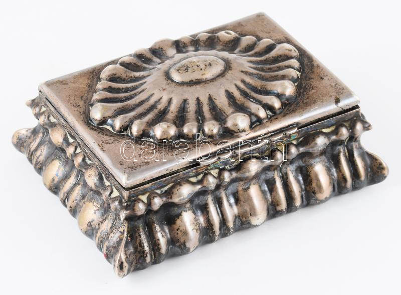 Ezüst (Ag) ékszeres doboz, fa betéttel, belül fedele aranyozott, hólya... https://www.darabanth.com/hu/498-Gyorsarveres/498.0/Nemesfem-disztargyak-ekszerek-dragakovek/Nemesfem-disztargyak-ekszerek-dragakovek~500002/Ezust-Ag-ekszeres-doboz-fa-betettel-belul-fedele-aranyozott-holyagolt-hengeres-mintaval-~II3397499