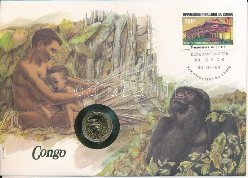 Kongó felbélyegzett borítékban, bélyegzéssel, benne Nyugat Afrikai Államok 1983. 10Fr, német nyelvű leírással T:UNC Congo in envelope with stamp and cancellation, in it West African States 1983. 10 Francs with German language description C:UNC