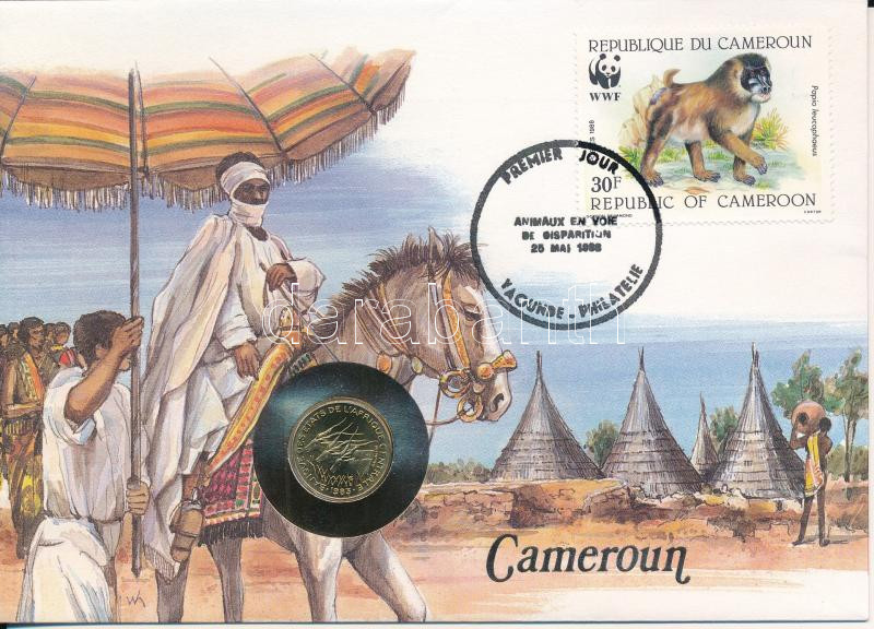 Közép-afrikai Államok 1983. 5Fr Al-bronz "Kamerun" érmés borítékban, Egyenlítői Guinea bélyeggel és bélyegzéssel, német nyelvű leírással T:UNC