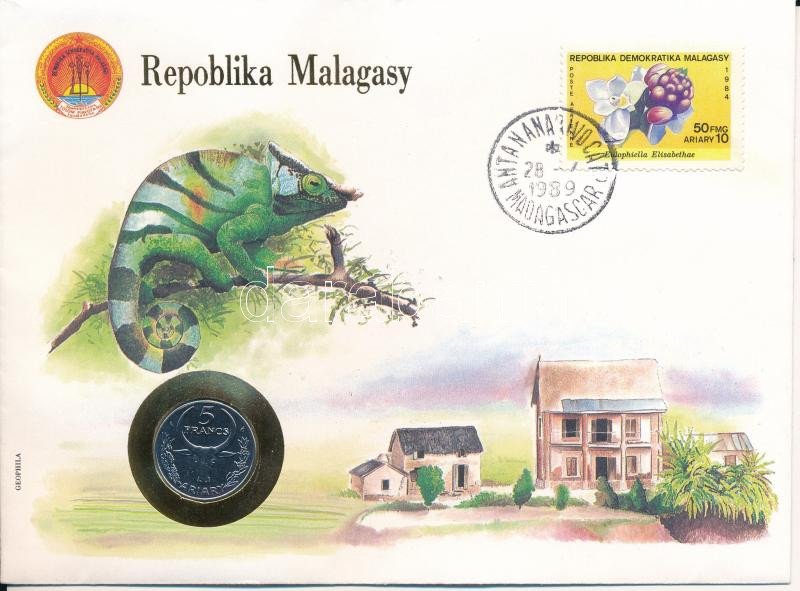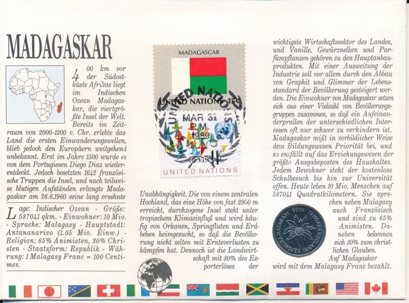 Madagaszkár 1986. 5Fr Cu-Ni felbélyegzett borítékban, ENSZ bélyegzéssel, német nyelvű leírással T:UNC