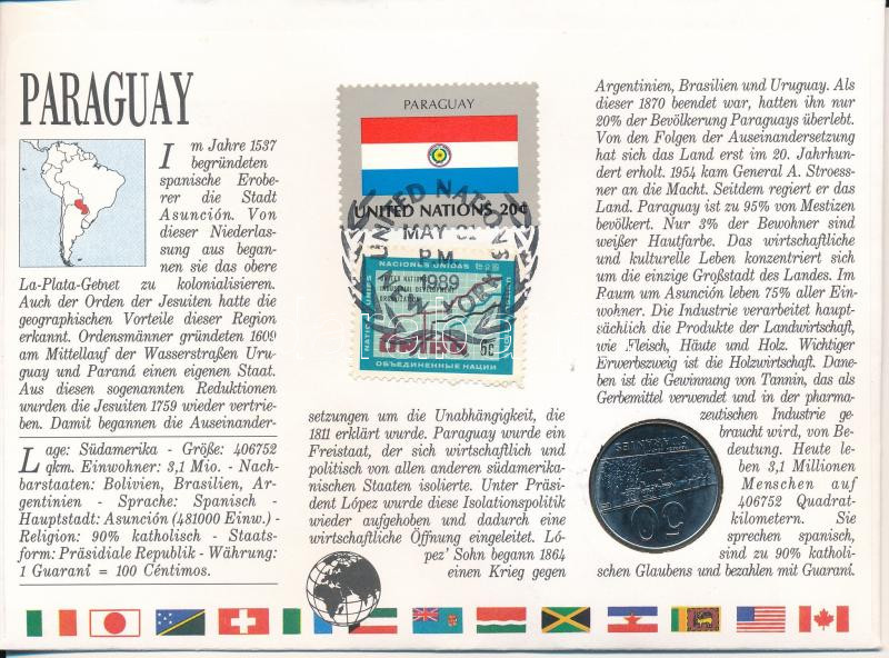 Paraguay 1986. 50G Ni felbélyegzett borítékban, ENSZ bélyegzéssel, német nyelvű leírással T:UNC Paraguay 1986. 50 Guaranies Ni in envelope with United Nations stamp and cancellation, with German description C:UNC