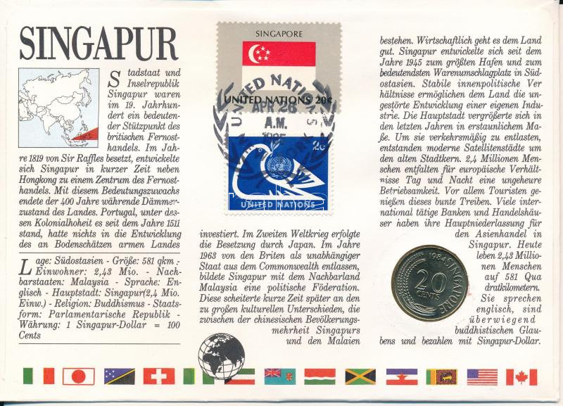 Szingapúr 1984. 20c felbélyegzett borítékban, ENSZ bélyegzéssel, német nyelvű leírással T:UNC Singapore 1984. 20 Cents in envelope with United Nations stamp and cancellation, with German description C:UNC