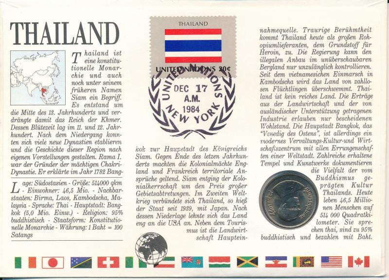 Thaiföld 1982. 1B Cu-Ni "IX. Ráma" felbélyegzett borítékban, ENSZ bélyegzéssel, német nyelvű leírással T:UNC Thailand 1982. 1 Bhat Cu-Ni "Rama IX" in envelope with United Nations stamp and cancellation, with German description C:UNC