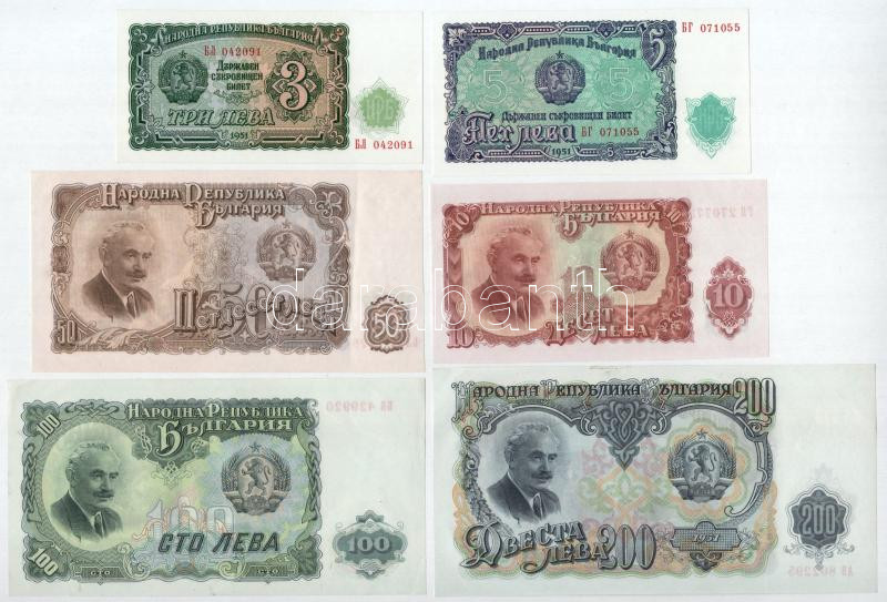 Bulgaria 1951. 3 Leva - 200 ... https://www.darabanth.com/hu/498-Gyorsarveres/498.0/Numizmatika/Kulfoldi-bankjegyek~1000103/Bulgaria-1951-3L-200L-6xklf-TAU-XF3Cbr-3E-Bulgaria-1951-3-Leva-200-Leva-6xdiff-CAU-XF3Cb~II3261551