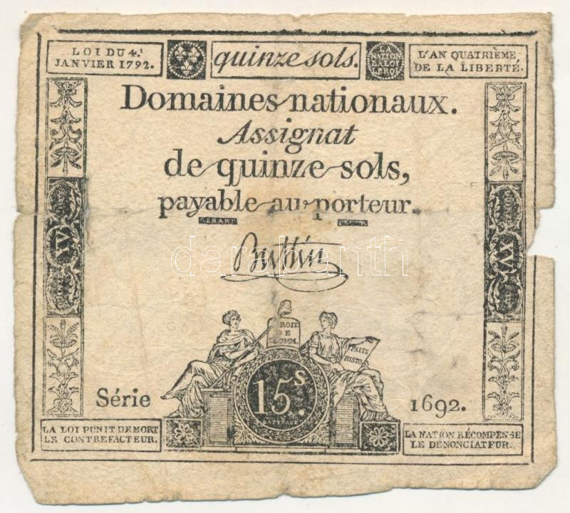 France 1792. 15 Sol... https://www.darabanth.com/hu/498-Gyorsarveres/498.0/Numizmatika/Kulfoldi-bankjegyek~1000103/Franciaorszag-1792-15s-Assignata-TF3Cbr-3E-France-1792-15-Sol-Assignata-CF3Cbr-3E-Krause-A6~II3395757