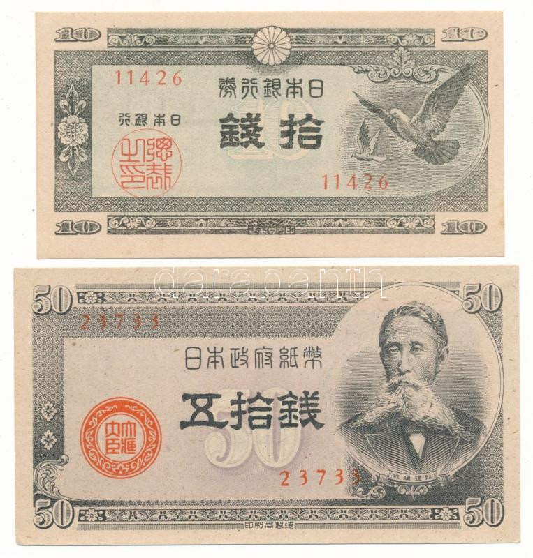 Japán DN(1947) 10s "11426" + DN(1948) 50s "23733" ... https://www.darabanth.com/hu/498-Gyorsarveres/498.0/Numizmatika/Kulfoldi-bankjegyek~1000103/Japan-DN1947-10s-11426-plus-DN1948-50s-23733-TAU-sarokhajlas3Cbr-3E-Japan-ND1947-10-Sen-~II3402251