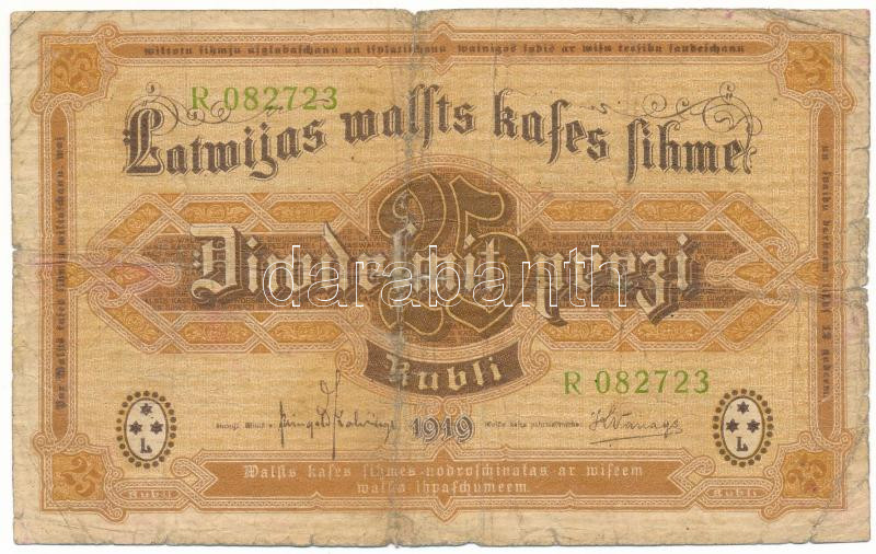 Latvia 1919. 25 Rublis C:VG te... https://www.darabanth.com/hu/498-Gyorsarveres/498.0/Numizmatika/Kulfoldi-bankjegyek~1000103/Lettorszag-1919-25R-TVG-beszakadasok3Cbr-3E-Latvia-1919-25-Rublis-CVG-tears3Cbr-3E-Krause-P235~II3261144