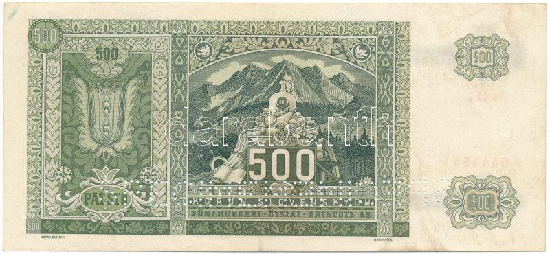 Leírás: Szlovákia 1941. 500K "6 D e 044455", "SPECIMEN (MINTA )" perforációval T:XF / Slovakia 1941. 500 Korun "6 D e 044455" with "SPECIMEN " perforation C:XF