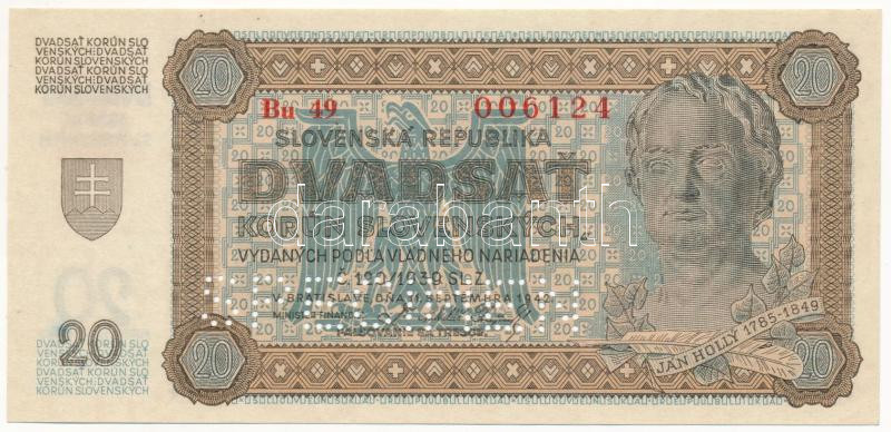 Leírás: Szlovákia 1942. 20K "SPECIMEN (MINTA )" perforációval, "Bu 49 006124" T:AU / Slovakia 1942. 20 Korun with "SPECIMEN " perforation, "Bu 49 006124" C:AU