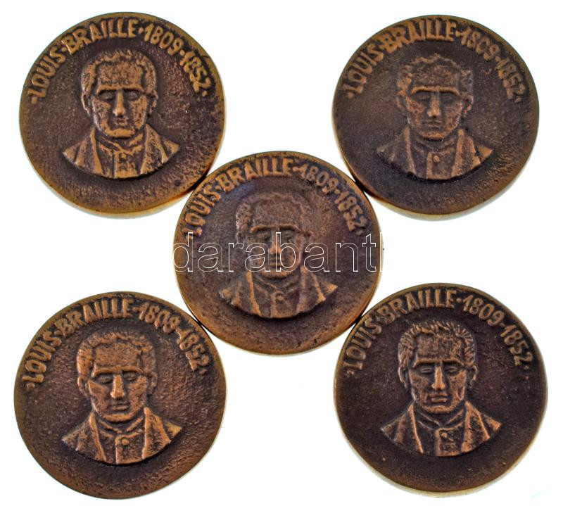 Leírás: 1990 k. "Louis Braille 1809-1852" kétoldalas bronz emlékérem (5x) (35mm) T:AU ~1990. "Louis Braille 1809-1852" two-sided bronze commemorative medallion (5x) (35mm) C:AU