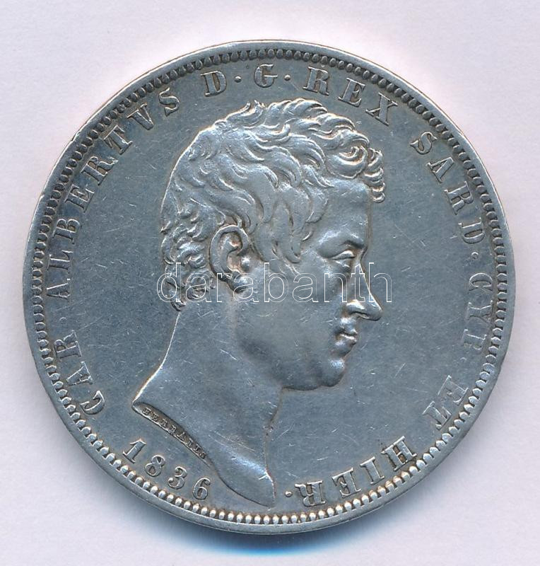 Italian States / Kingdom of Sardinia 1836. 5 Lire Ag "Charles Albert" C:XF,VF small edge error