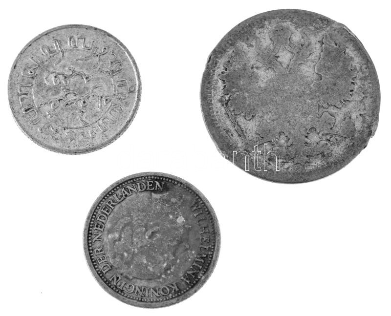 Vegyes 3db-os kisezüst érmetétel, közte Hollandia 1937. 10c Ag "I. Vilma" + Holland Kelet-India / Indonézia 1940. 1/10G Ag + Orosz Birodalom 1903. 15k Ag T:XF-F patina, az egyiknél foglalatnyom 3pcs of Ag coin lot, in it Netherlands 1937. 10 Cents Ag "Wilhelmina" + Netherlands East Indies / Indonesia 1940. 1/10 Gulden Ag + Russian Empire 1903. 15 Kopecks Ag C:XF-F patina, one with frame marks