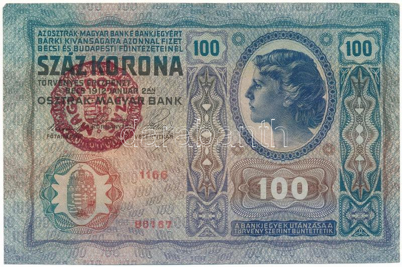 Leírás: 1912. 100K "1166 86167", piros "MAGYARORSZÁG " felülbélyegzéssel T:F, szép papír