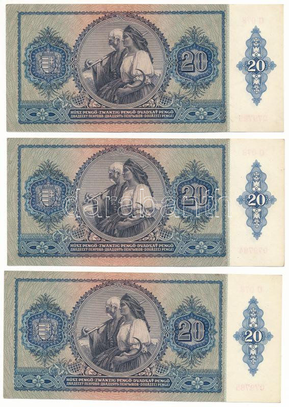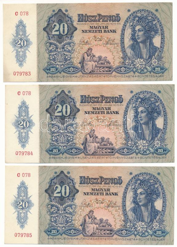 Leírás: 1941. 20P (3x) sorszámkövetők "C 078 079783 - C 078 079785" T:XF kis folt