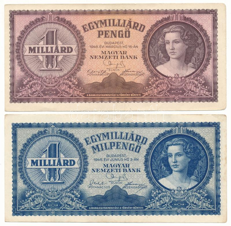 1946. 1.000.000.000P + 1.000.000.000MP T:F,VF szép papír https://www.darabanth.com/hu/498-Gyorsarveres/498.0/Numizmatika/Magyar-bankjegyek~1000097/1946-1000000000P-plus-1000000000MP-TF-VF-szep-papir~II3401810