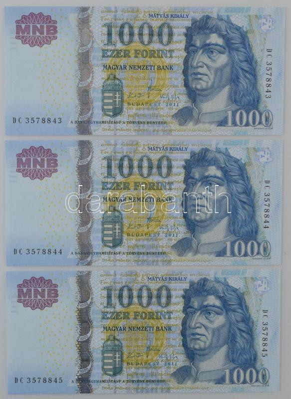 2011. 1000Ft (3x) sorszámkövetők "DC 3578843 - DC 3578845" T... https://www.darabanth.com/hu/498-Gyorsarveres/498.0/Numizmatika/Numizmatikai-tetelek-rendkivul-alacsony-kikialtasi-aron~1000090/2011-1000Ft-3x-sorszamkovetok-DC-3578843-DC-3578845-TUNC3Cbr-3E-Adamo-F55N~II3400741