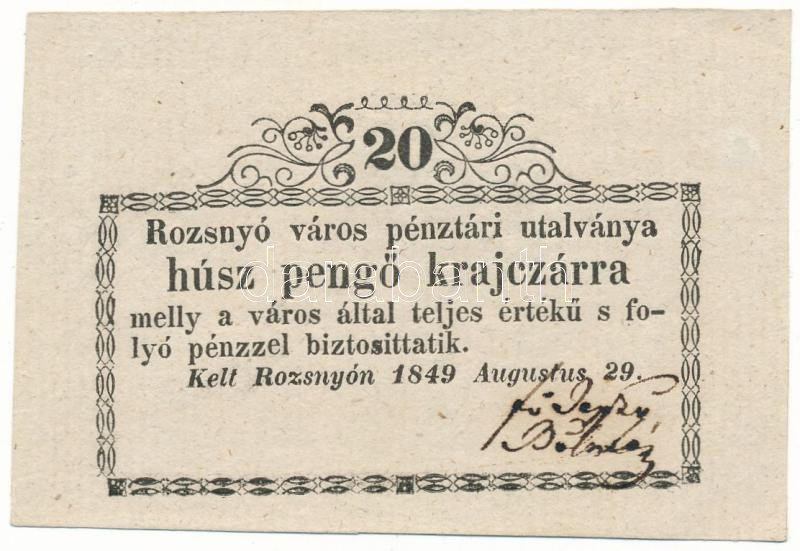 ... https://www.darabanth.com/hu/498-Gyorsarveres/498.0/Numizmatika/Papir-es-fem-szuksegpenzek~1000096/1849-Rozsnyo-20kr-Rozsnyo-varos-penztari-utalvanya-TAU3Cbr-3E-Hungary-Rozsnyo-1849-20-~II3401491