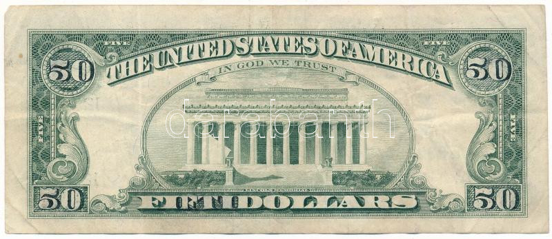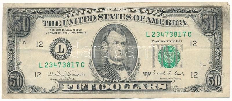 Amerikai Egyesült Államok 1988A 5$ bankjegy átkasírozva hamis 50$ címletre, mindkét oldalon hibás "FIFTI" szövegezéssel, több helyen is "FIVE" jelöléssel, Lincoln portréja alatt "GRANT" szöveggel. T:F