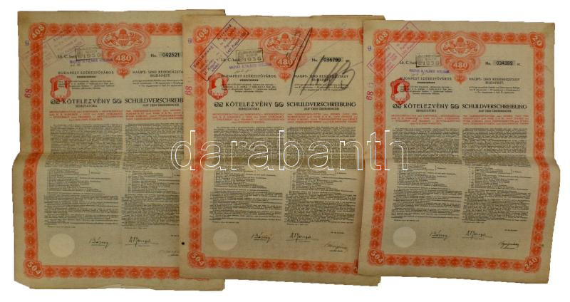 1914 Budapest "Budapest Székesfőváros" 4 1/2%-os kötelezvény bemutatóra 480K-ról, magyar és német nyelven, szárazpecséttel, felülbélyegzésekkel, szelvényekkel, vízjeles papíron (3x) T:F