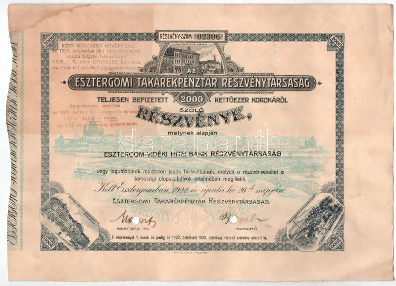 1922 Esztergom "Esztergomi Takarékpénztár Részvénytársaság" ... https://www.darabanth.com/hu/498-Gyorsarveres/498.0/Numizmatika/Reszvenyek-es-sorsjegyek~1000095/1922-Esztergom-3Cem3EEsztergomi-Takarekpenztar-Reszvenytarsasag3Cem3E-reszvenye-2000K-rol-s~II3278132