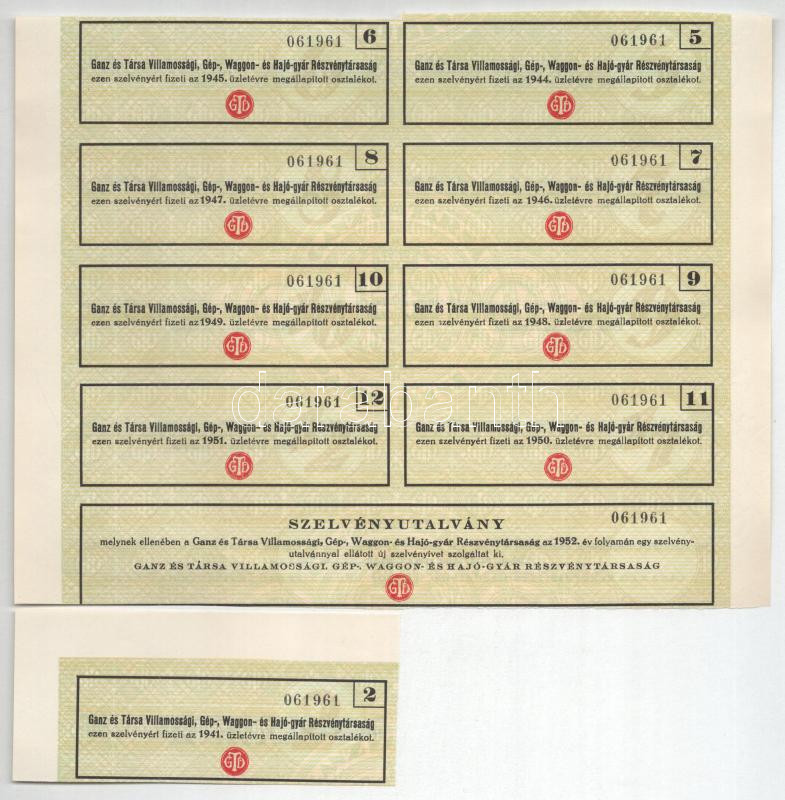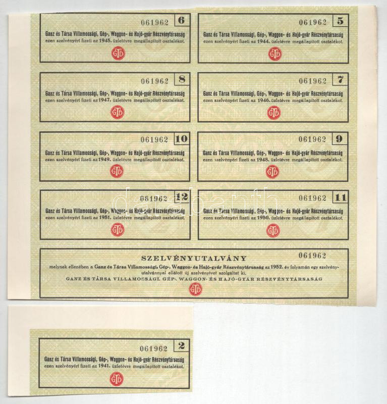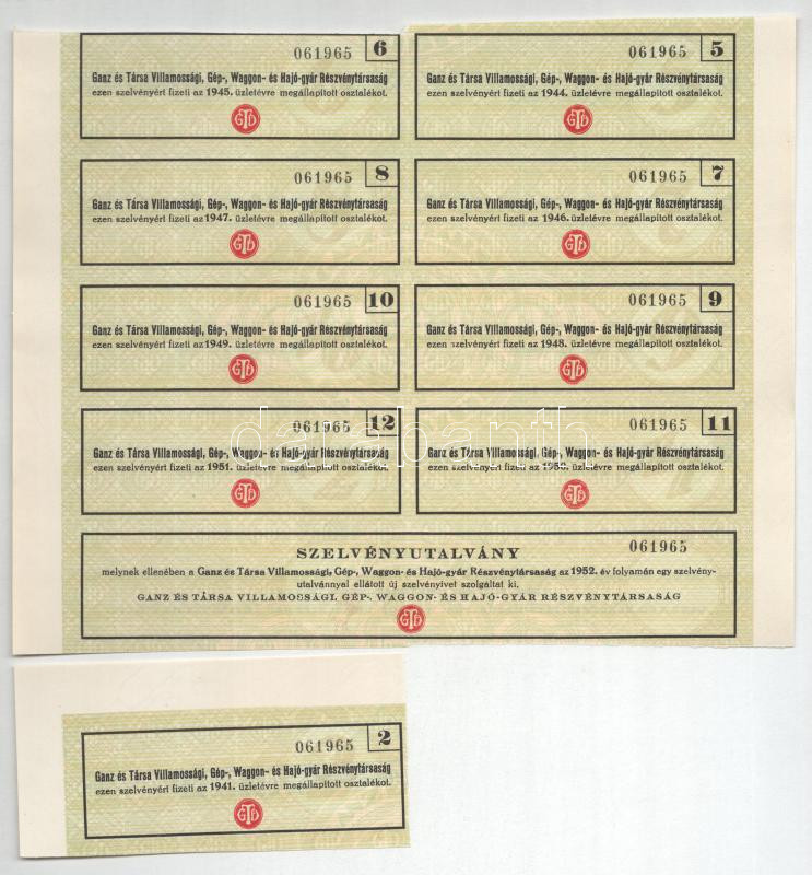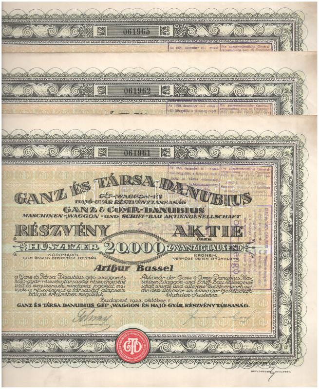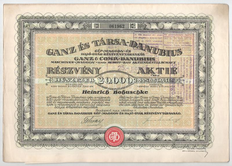 1923 Budapest "Ganz és Társa- Danubius Gép-, Waggon- és Hajó-Gyár Részvénytársaság" részvénye 20.000K-ról, magyar és német nyelven, szárazpecséttel, bélyegzésekkel és szelvényekkel (3x, sorszámkövető és közeli sorszám) T:XF